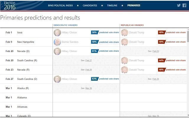 Microsoft previewed its first results last week in a blog post. It had Donald Trump easily winning the first four GOP races, while Hillary Clinton took three races (Iowa, South Carolina and Nevada) and Bernie Sanders won the Iowa caucus.